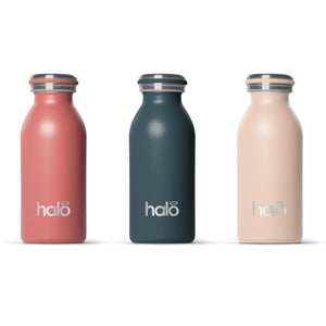 The Candlelight 350ml Set, featuring Coral, Gunsmoke and Sorbet in 350ml. Say Halo to your new lightweight companions and goodbye to lugging around heavy bottles. With a premium stainless steel design, you'll enjoy every sip without any metallic aftertaste. 100% BPA and toxin-free.